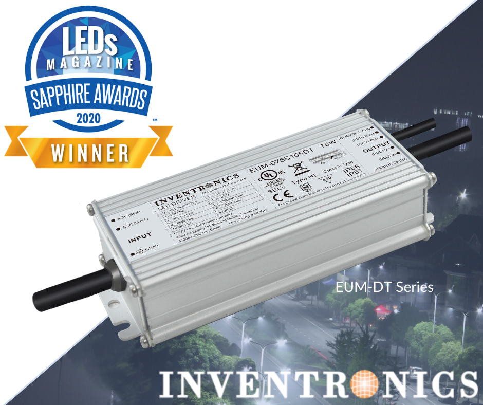 Inventronics EUM-DT series has been selected as a 2020 Sapphire Award winner in the LED driver category. The Sapphire Awards, hosted by LEDs Magazine was held February 12, 2020 aboard the USS Midway Museum in San Diego, CA.