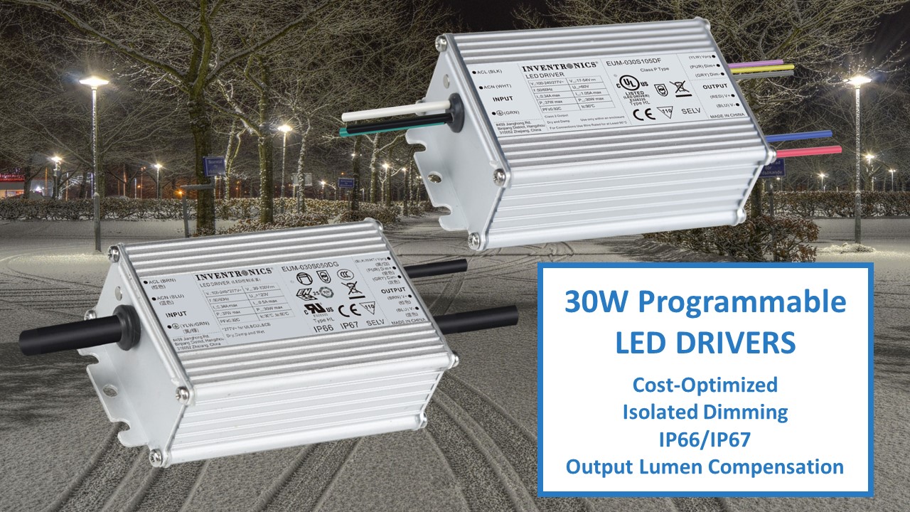 Inventronics has expanded their low power programmable LED drivers to include models offering 30W power levels. The EUM-030SxxxDx series offer several model options with several safety certifications and universal input voltage input to accommodate a multitude of applications and world-wide use. They offer design flexibility, ease of managing variations in projects and a rugged, reliable performance with built-in protection from surge and water ingress. They are ideal for low bay, tunnel, pathway and wall pack lighting.