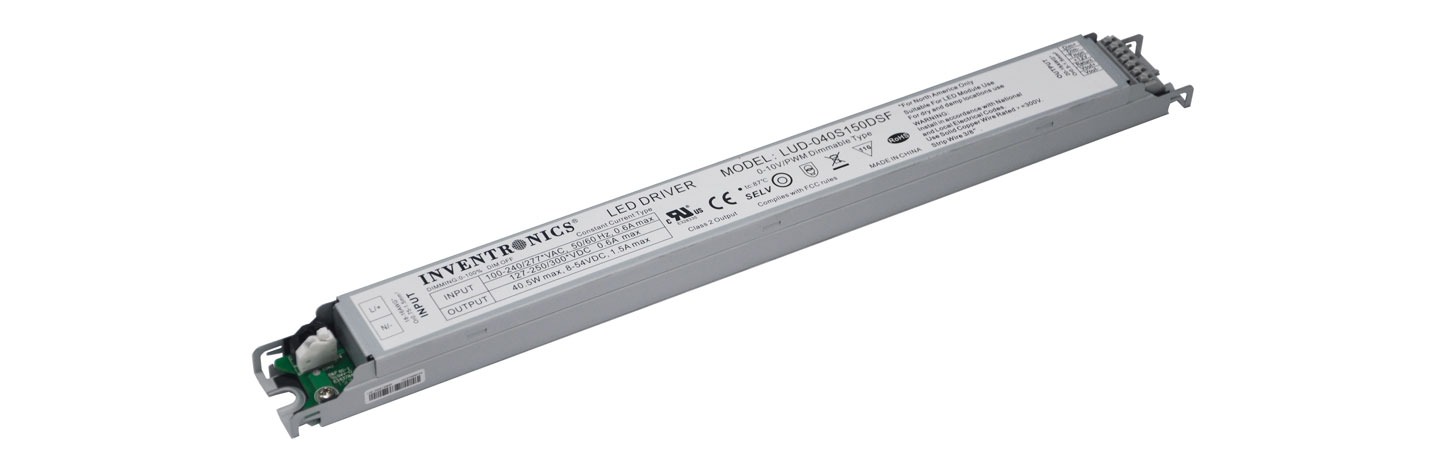 Inventronics has announced the release of a new series of 40W slim programmable constant current LED drivers for lighting applications including dimmable panel lights and linear lights. The LUD-040SxxxDSF series allows current to be programed to ensure a perfect fit with every LED design as well as being “future-proof” since it can accommodate new LED generations. They are dimmable to 5% by 0-10V, PWM or time dimming and have 2 constant-power models to deliver the full 40W at almost any output current between 350 mA and 1500mA. Each model offers low ripple for flicker-free operation and a lifetime calculated to be at least 96,000 hours when operating at 80% load with a case temperature of 60°C.