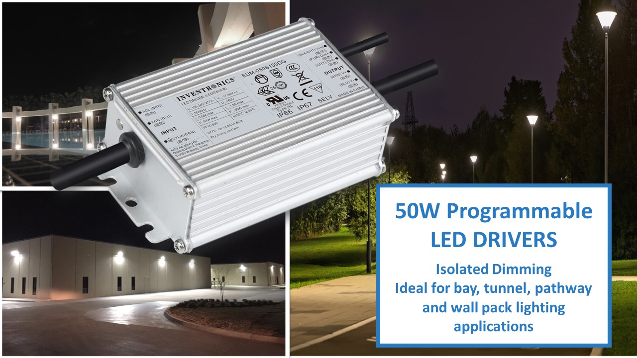 Inventronics has expanded their new EUM-Dx family of programmable LED drivers to include models offering 50W power levels which are an extension to their existing 75W, 100W, 150W, 200W and 240W models. The EUM-050SxxxDx simplify inventory management, provide constant-power programmability, flicker-free output, smooth dimming and IP66 and IP67 rated for harsher applications. The EUM-050SxxxDx series also introduces two new models to the EUM family that are suitable for Class II luminaires and equipped with flying leads.