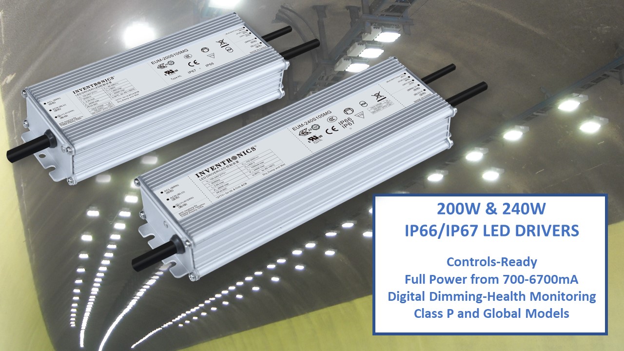 This new driver family is programmable via Inventronics programming software and currently offers two separate driver series. The EUM-200SxxxMx supplies the full 200W of power from 700-5600mA and the EUM-240SxxxMx supplies the full 240W of power from 700-6700mA. The EUM-MG models are equipped with a global cable that can be used world-wide to help reduce inventory SKUs and minimize overstock and the EUM-MT models bring the added convenience of UL Class P to allow manufacturers to quicken their speed to market.