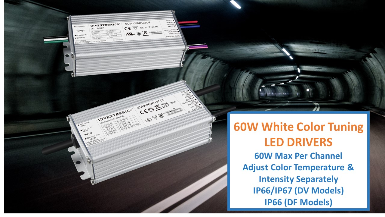 Inventronics introduces the first dual channel, white color tuning LED drivers for outdoor applications where the environment is more challenging, such as tunnels, signage and streetlights. The EUW-060S105Dx utilize a leading-edge design to achieve a high level of surge protection, enhanced encapsulation process and a proprietary magnetic design offering a smaller footprint over traditional drivers. The EUW-060S105Dx also offers independent control and the full 60W of power per channel allowing for superior flexibility and reduced installation costs by eliminating the need to utilize multiple single output drivers.