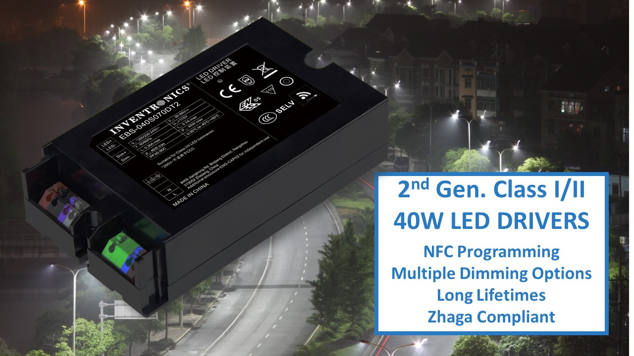 Inventronics announced the release of a new generation for their EBS family of IP20, Class I/II LED drivers. They provide reduced maintenance costs, streamlined production and simpler installation. They are highly reliable with built-in protection, long lifetimes and market-leading efficiency.
