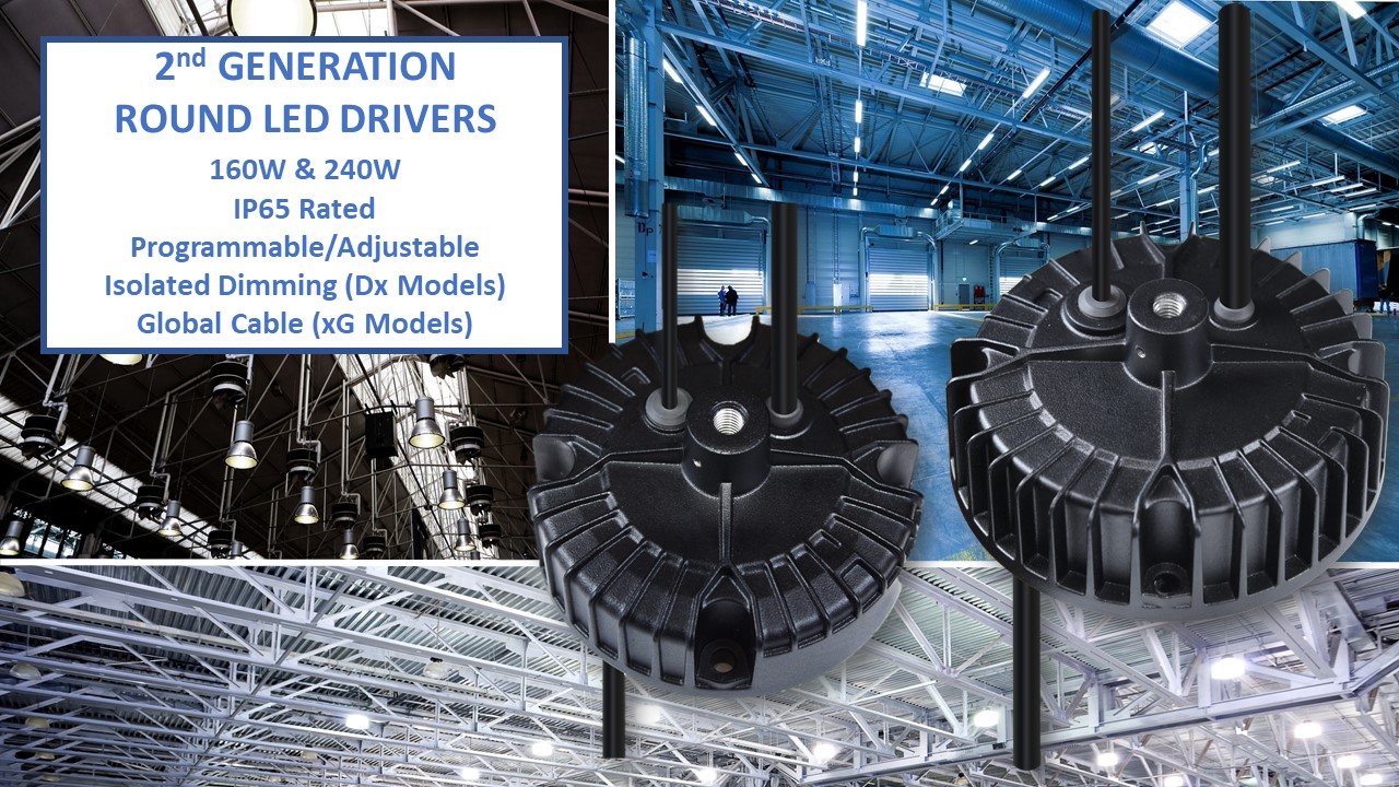 Inventronics has announced the release of their 2nd generation EUR family of round, programmable LED drivers with a more compact form factor, isolated dimming and added convenience of Dim-to-Low Voltage (DTLV). The resilient, round patented metal case ensures a streamlined appearance and higher level of reliability that makes them suitable for indoor and outdoor applications such as industrial, warehouse and sports arena lighting. The EUR-160 and 250 DG/SG models also minimize inventory by utilizing the global cable to reduce the number of SKUs needed for various applications while the EUR-160 and 250 DT/ST models are UL Class P certified to avoid any delay costs on new luminaire designs.