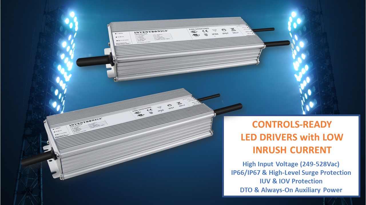 Inventronics expands their new family of high input voltage, Controls-Ready LED drivers to include 240W and 320W models.   These drivers deliver a cost-effective solution to connected lighting by eliminating additional installation equipment, providing industry-leading surge protection and delivering a reliable, long-life performance.
