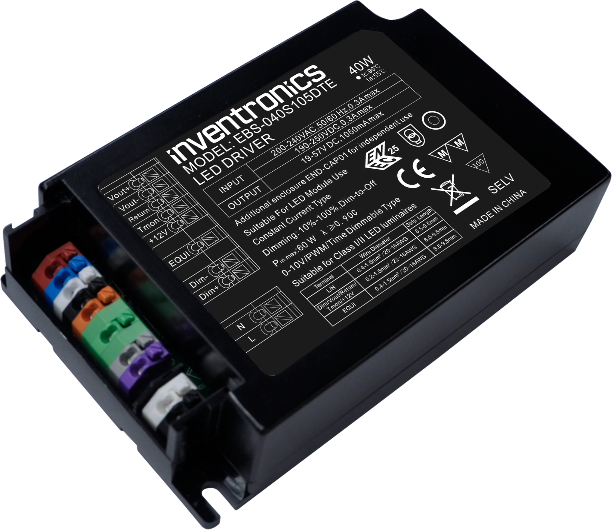 | 70-1050 mA | 700 – 1050 mA | 1050 mA | 19 – 57 Vdc | EBS-040S105DTE |