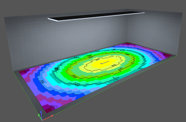 For light ceilings and similar applications, it is possible to generate a false color visualization of the illuminance distribution. This helps to quickly identify brightness levels, evaluate uniformity and optimize the design before installation.