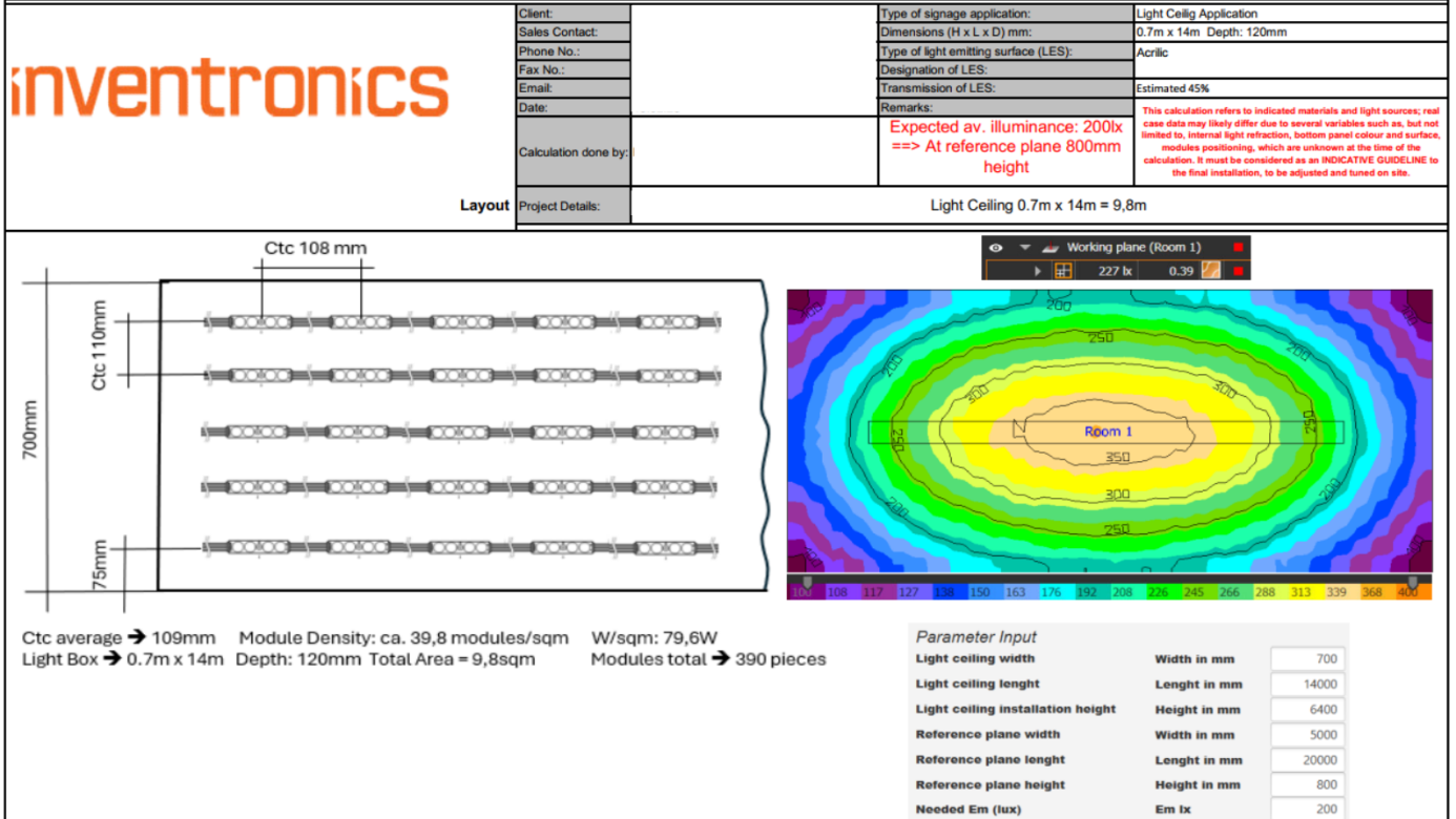To capture these requirements, Inventronics provides dedicated checklists for each application type. These checklists collect all relevant project data, including dimensions, material properties, required brightness and control options. For example, light ceiling projects require additional information such as room dimensions and mounting height to simulate realistic lighting conditions. Providing accurate and complete input is essential, as it directly impacts the quality of the lighting design.