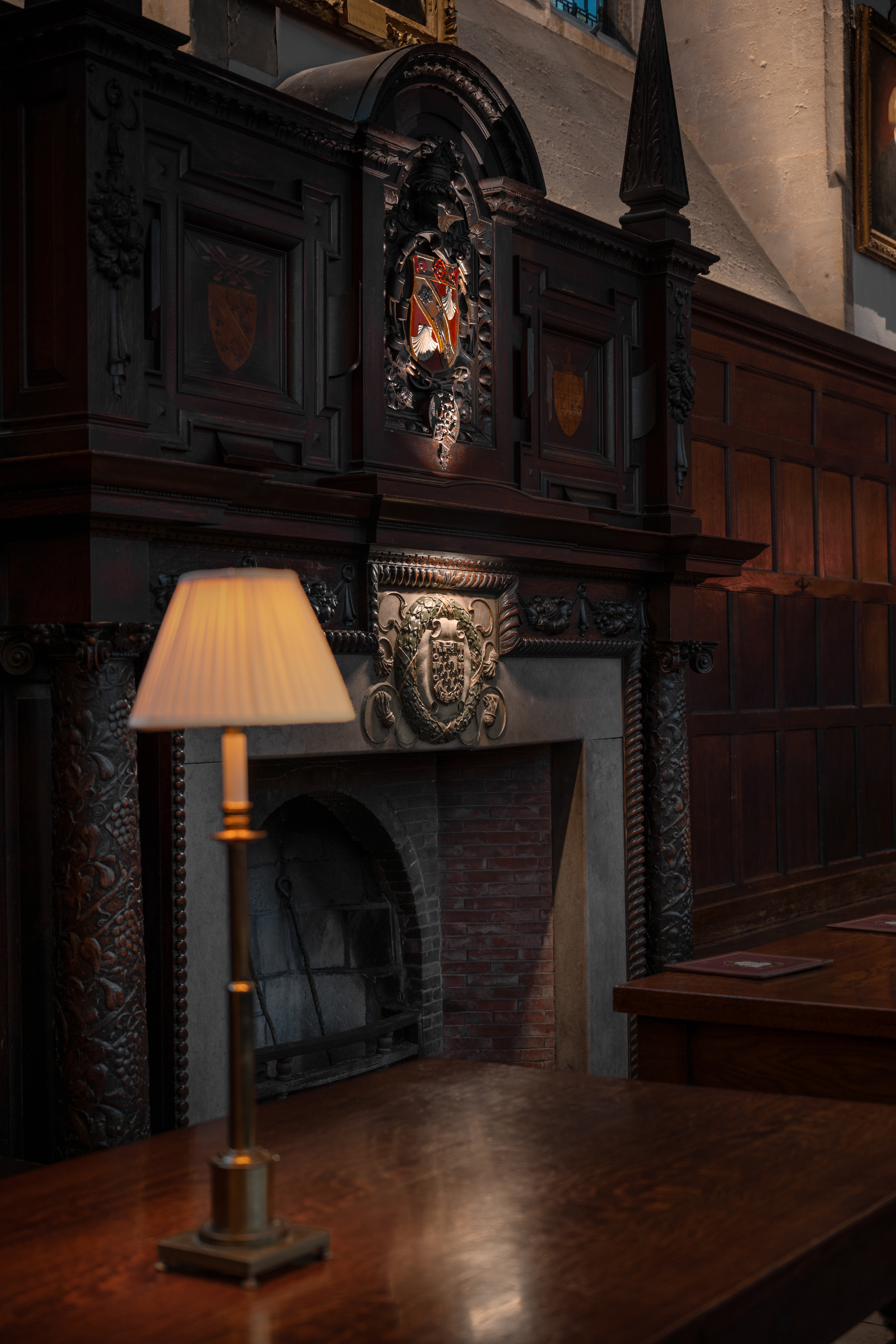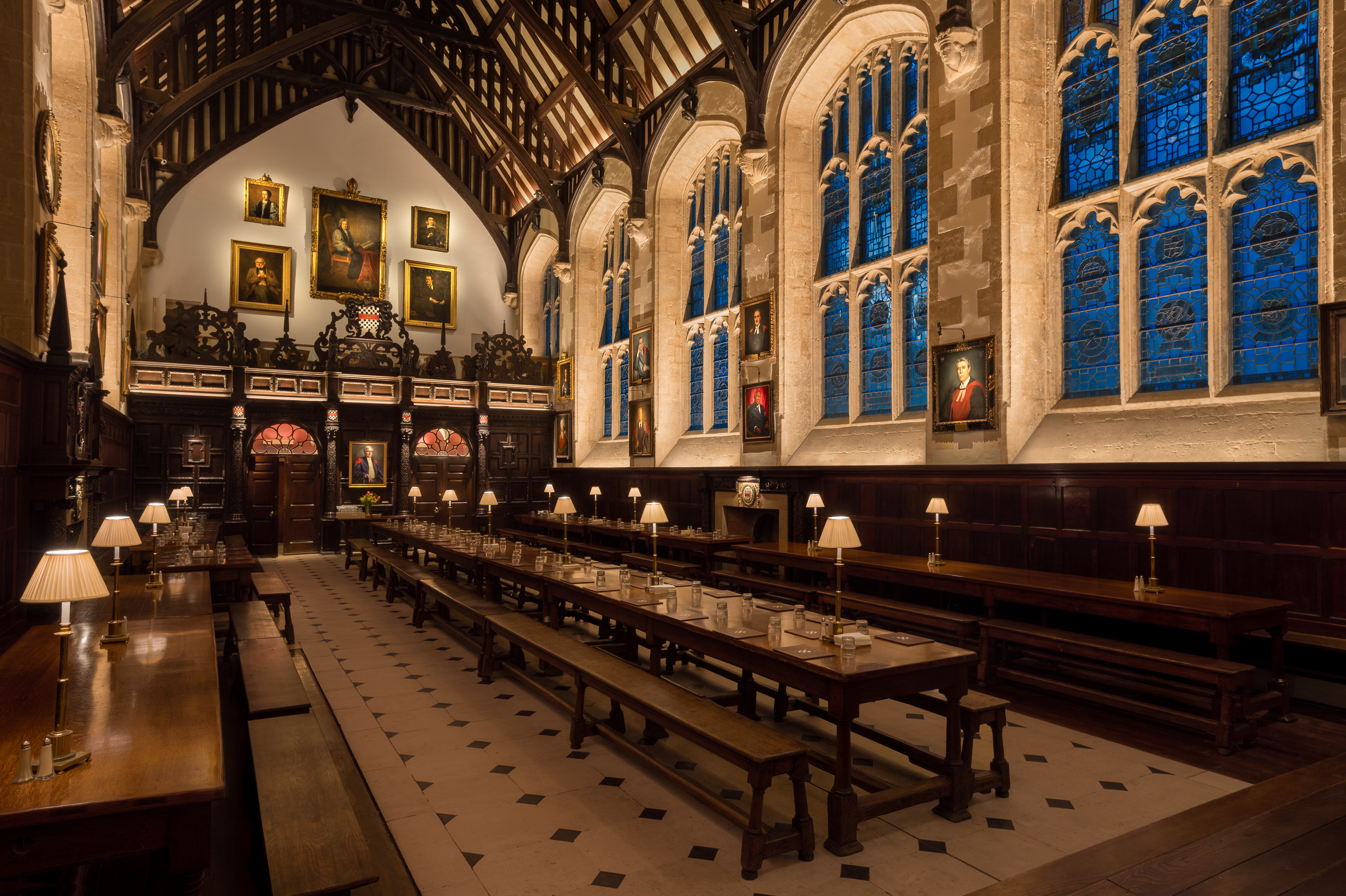 Linear lighting in window reveals and stone mullions reinforces the hall’s rhythm and highlights carved details. Additional spotlights enhance the high table, gallery, and key architectural elements. Existing table lights were retained and upgraded with warm-dim lamps, allowing a smooth transition from functional brightness to a soft, atmospheric evening glow.
